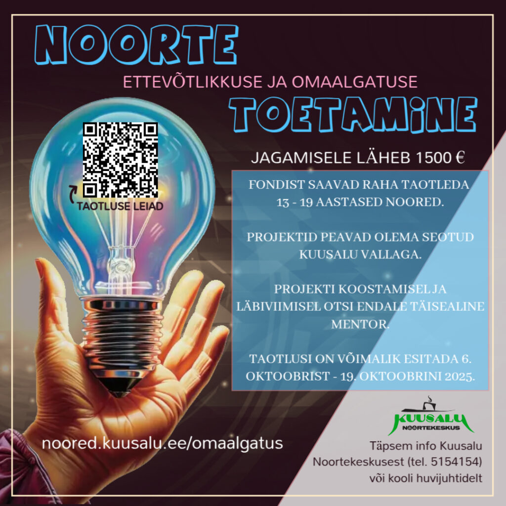 Avatud uus Noorte Ettevõtlikkuse ja Omaalgatuse toetuse taotlusvoor. Taotluse esitamisel kehtivad järgnevad tingimused: Toetus on eelkõige noorte süsteemse ja juhendatud huvitegevuse kättesaadavuse ja mitmekesisuse parandamiseks, eesmärgiga suurendada nende võimalusi omandada teadmisi, oskusi ja hoiakuid valitud huvialal.Projektitaotluse saab esitada 13-19 aasta vanune noor või noored.Projekti koostamisel ja läbiviimisel tuleb kaasata täisealine